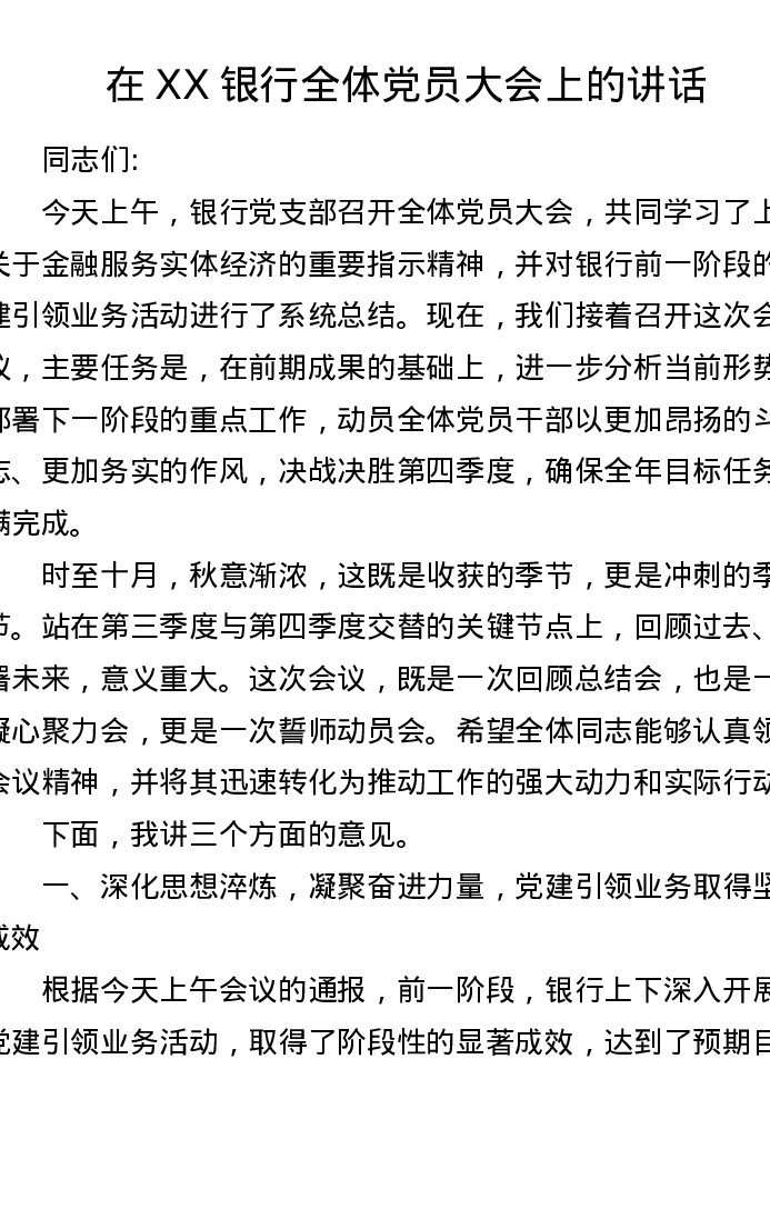 在 XX 银行全体党员大会上的讲话