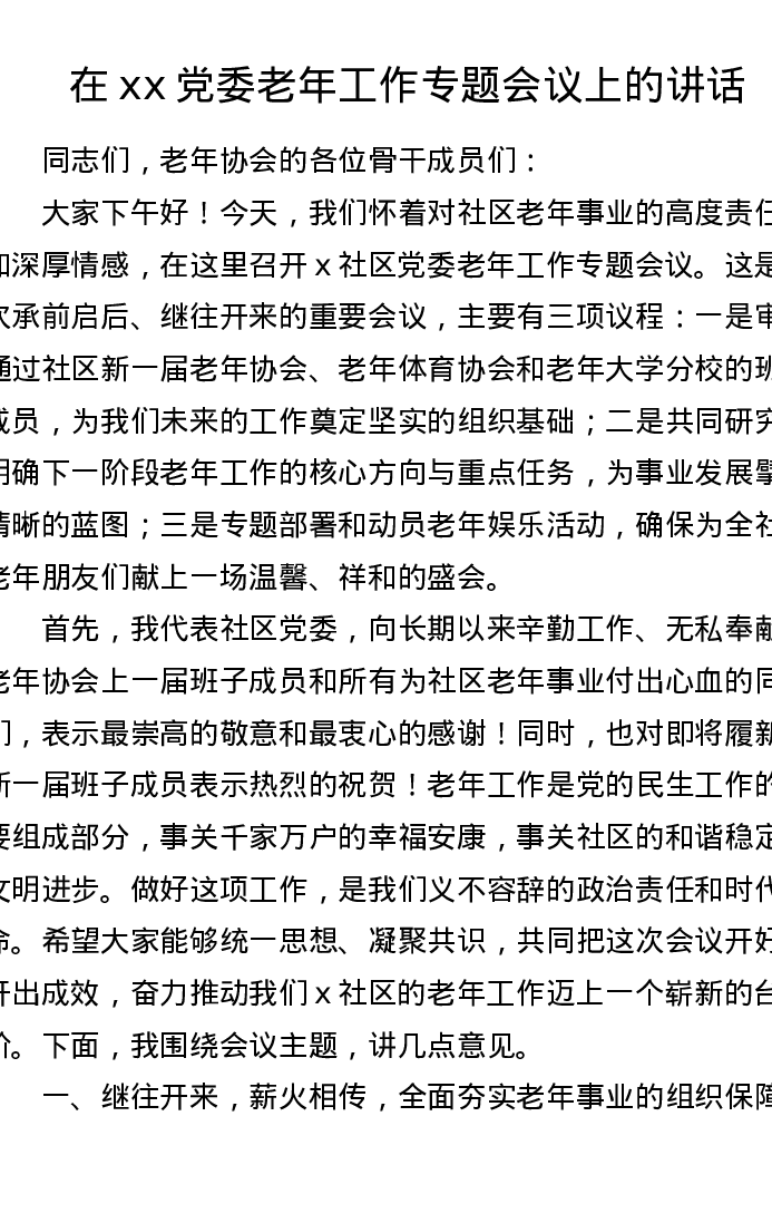 在xx党委老年工作专题会议上的讲话