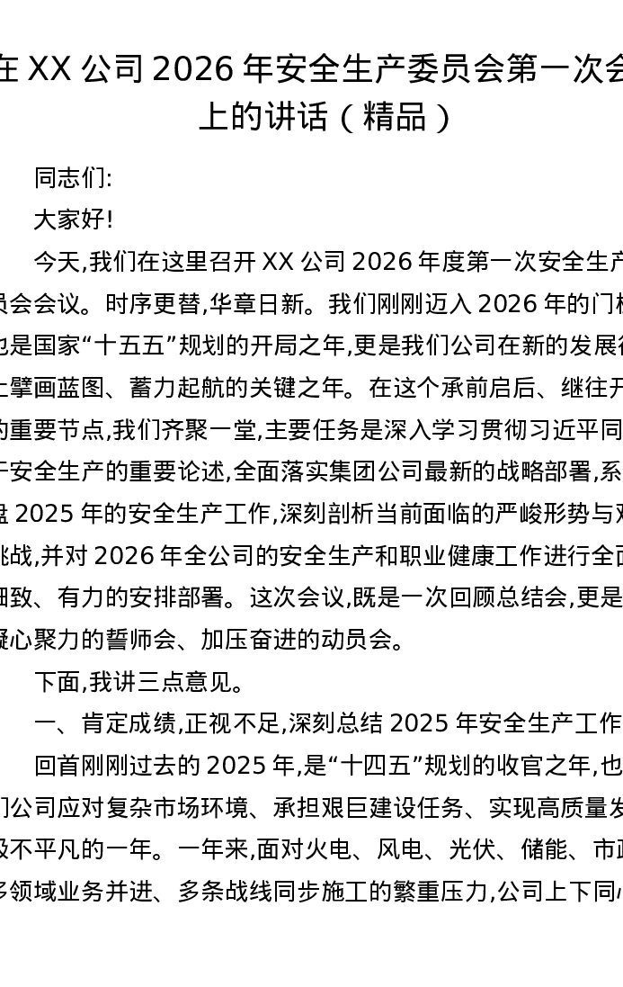 在XX公司2026年安全生产委员会第一次会议上的讲话