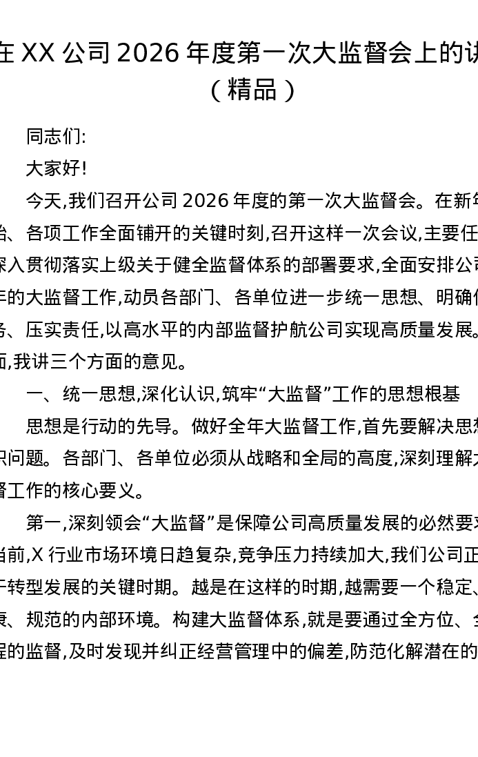 在XX公司2026年度第一次大监督会上的讲话