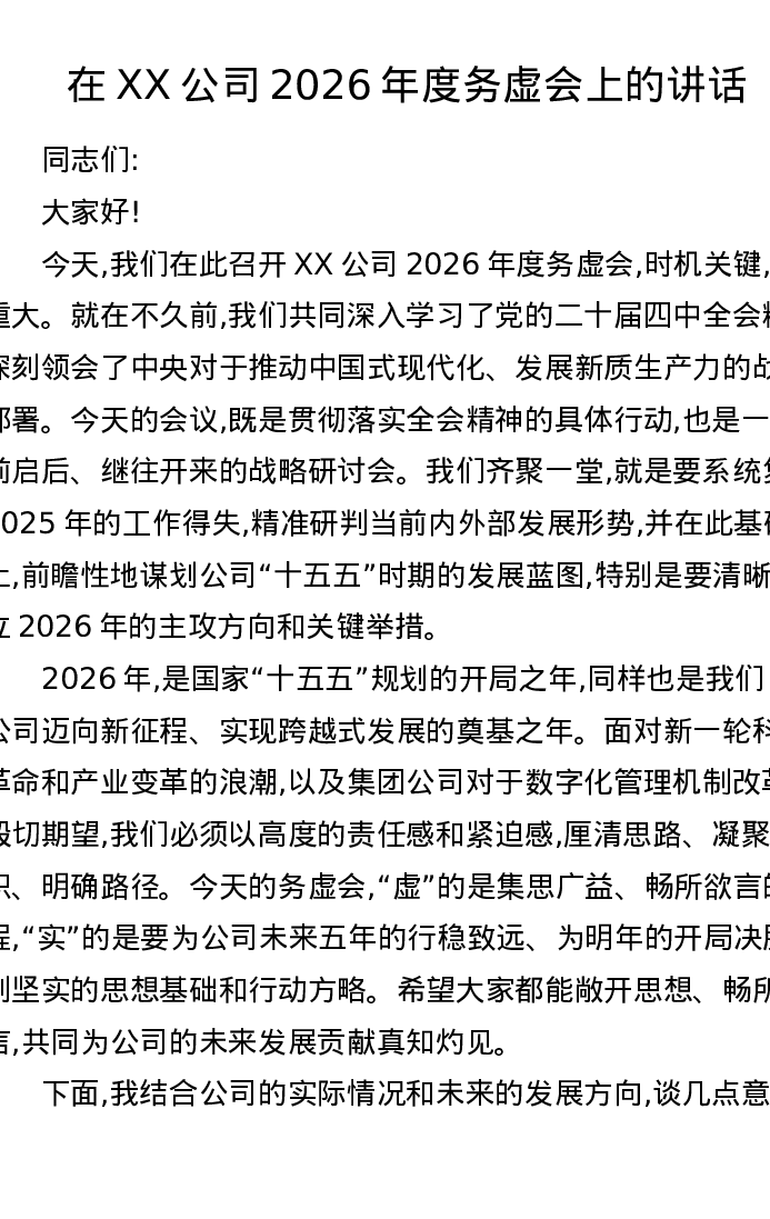在XX公司2026年度务虚会上的讲话