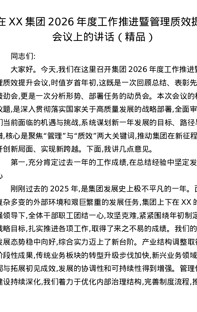在XX集团2026年度工作推进暨管理质效提升会议上的讲话