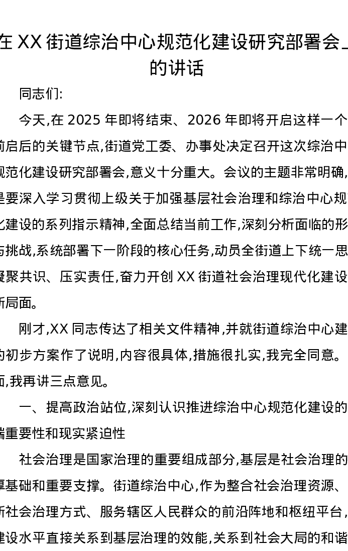 在XX街道综治中心规范化建设研究部署会上的讲话