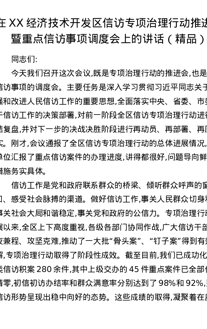 在XX经济技术开发区信访专项治理行动推进会暨重点信访事项调度会上的讲话