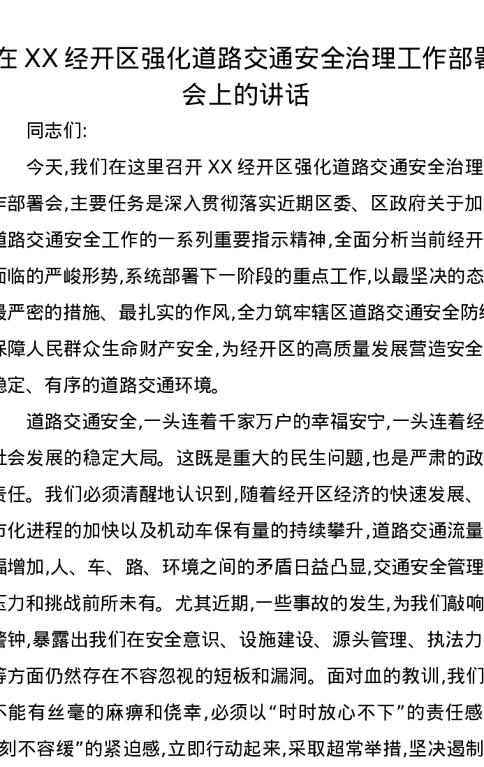 在XX经开区强化道路交通安全治理工作部署会上的讲话