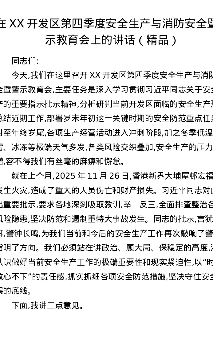 在XX开发区第四季度安全生产与消防安全暨警示教育会上的讲话