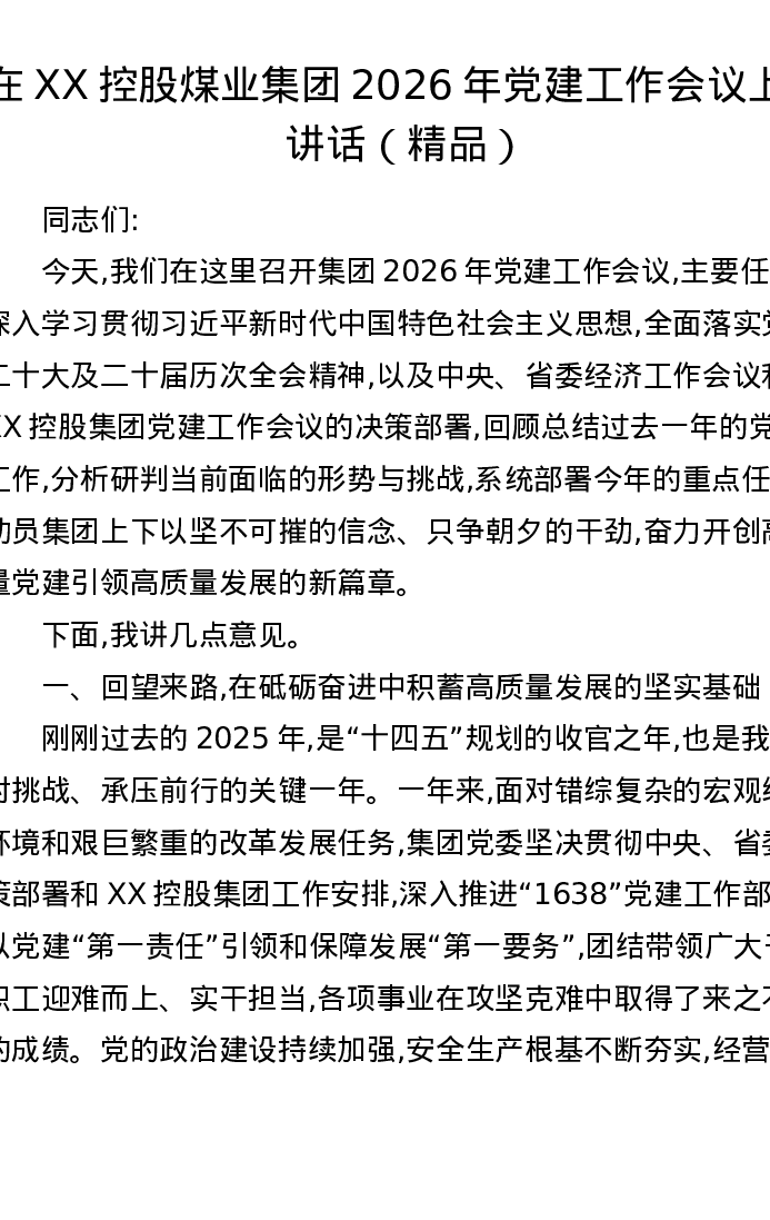 在XX控股煤业集团2026年党建工作会议上的讲话