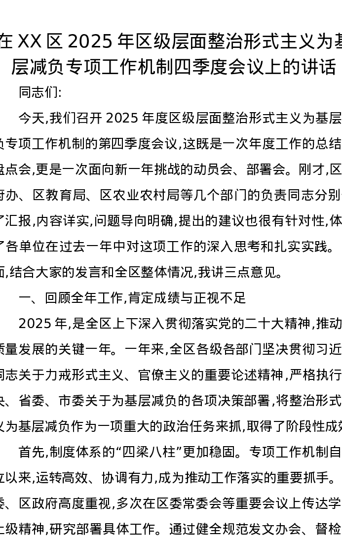在XX区2025年区级层面整治形式主义为基层减负专项工作机制四季度会议上的讲话2
