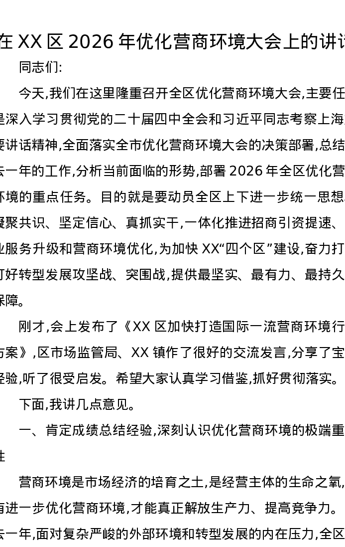 在XX区2026年优化营商环境大会上的讲话