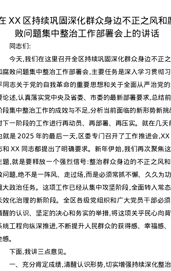 在XX区持续巩固深化群众身边不正之风和腐败问题集中整治工作部署会上的讲话