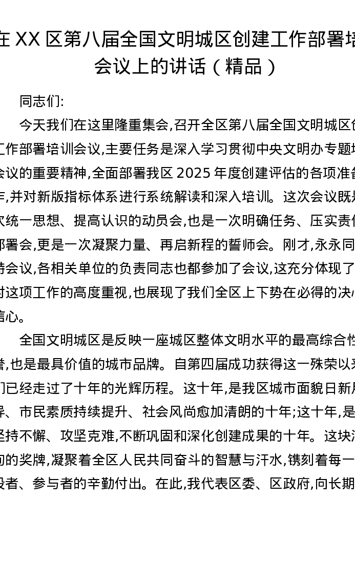 在XX区第八届全国文明城区创建工作部署培训会议上的讲话