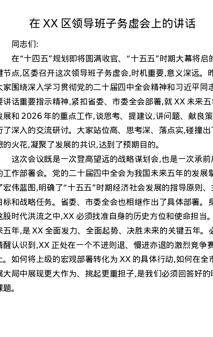 在XX区领导班子务虚会上的讲话