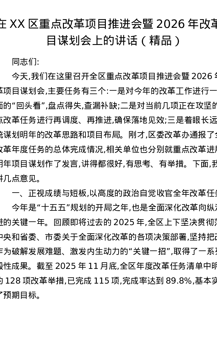 在XX区重点改革项目推进会暨2026年改革项目谋划会上的讲话