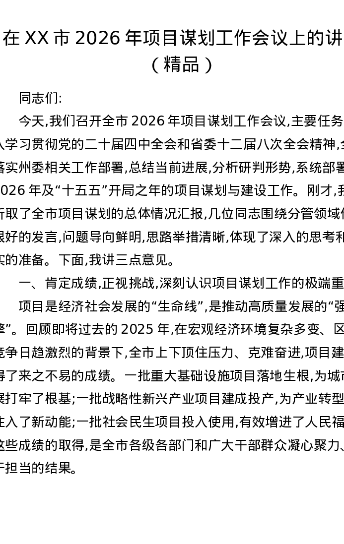 在XX市2026年项目谋划工作会议上的讲话