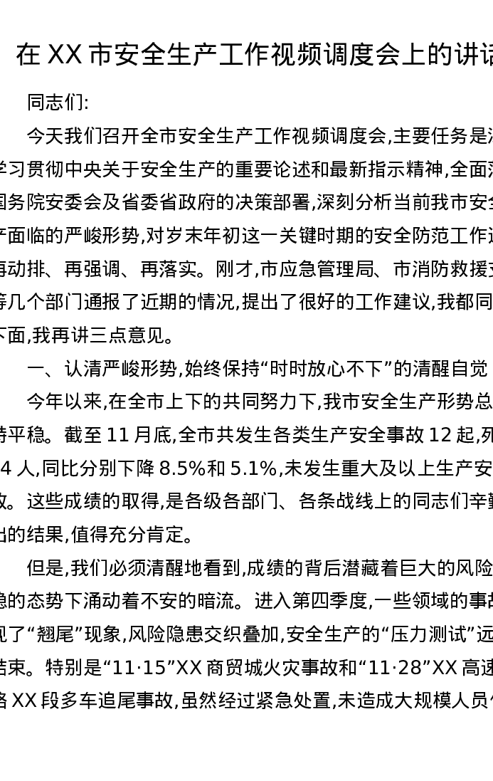 在XX市安全生产工作视频调度会上的讲话