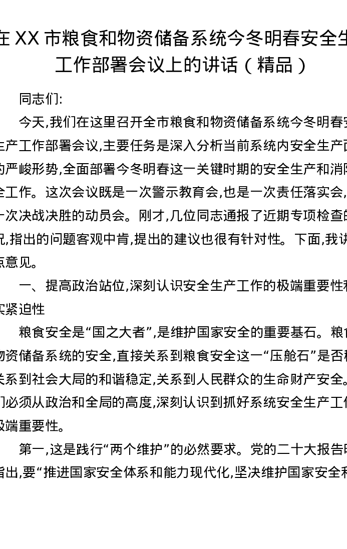 在XX市粮食和物资储备系统今冬明春安全生产工作部署会议上的讲话