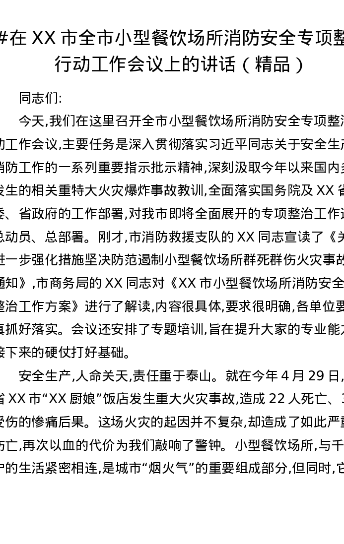 在XX市全市小型餐饮场所消防安全专项整治行动工作会议上的讲话