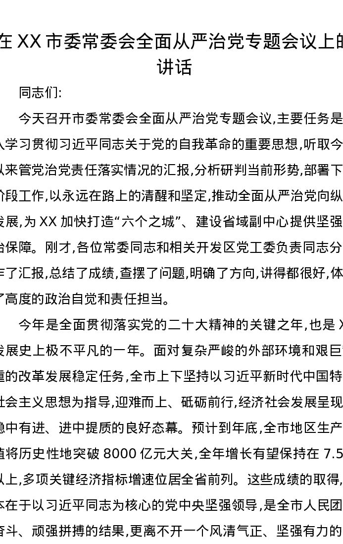 在XX市委常委会全面从严治党专题会议上的讲话2