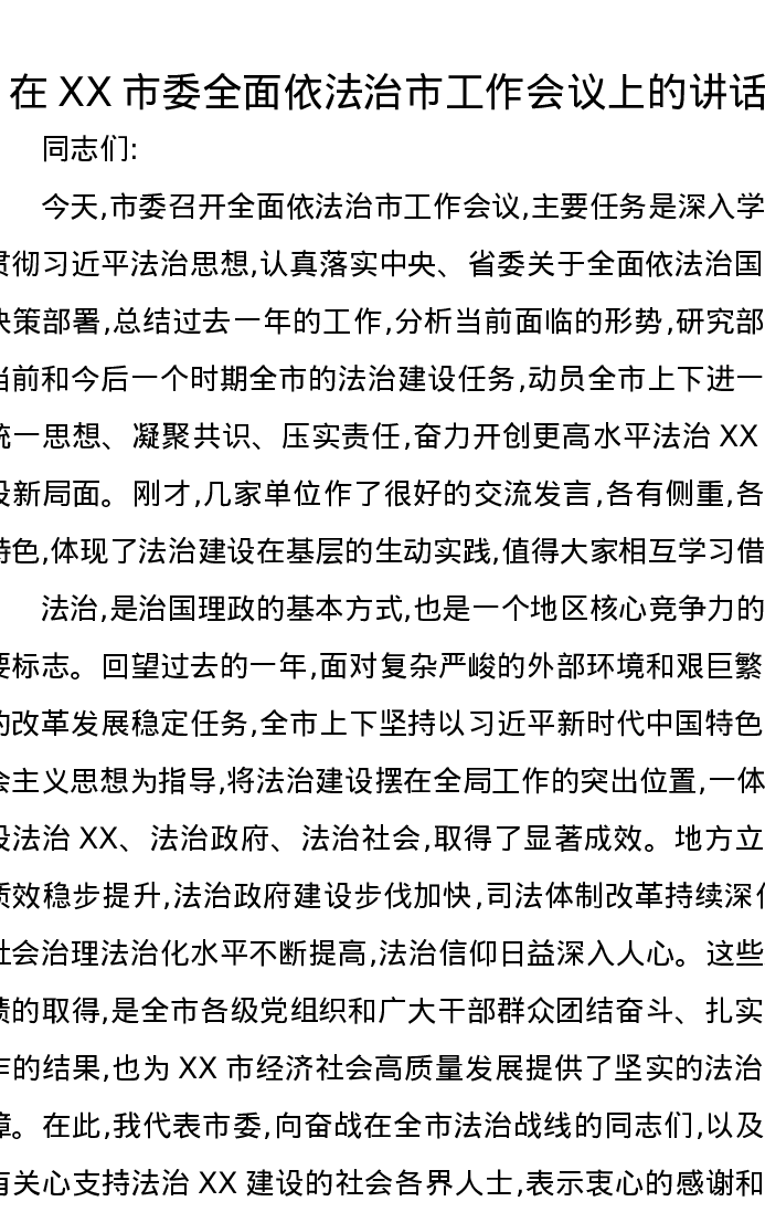 在XX市委全面依法治市工作会议上的讲话