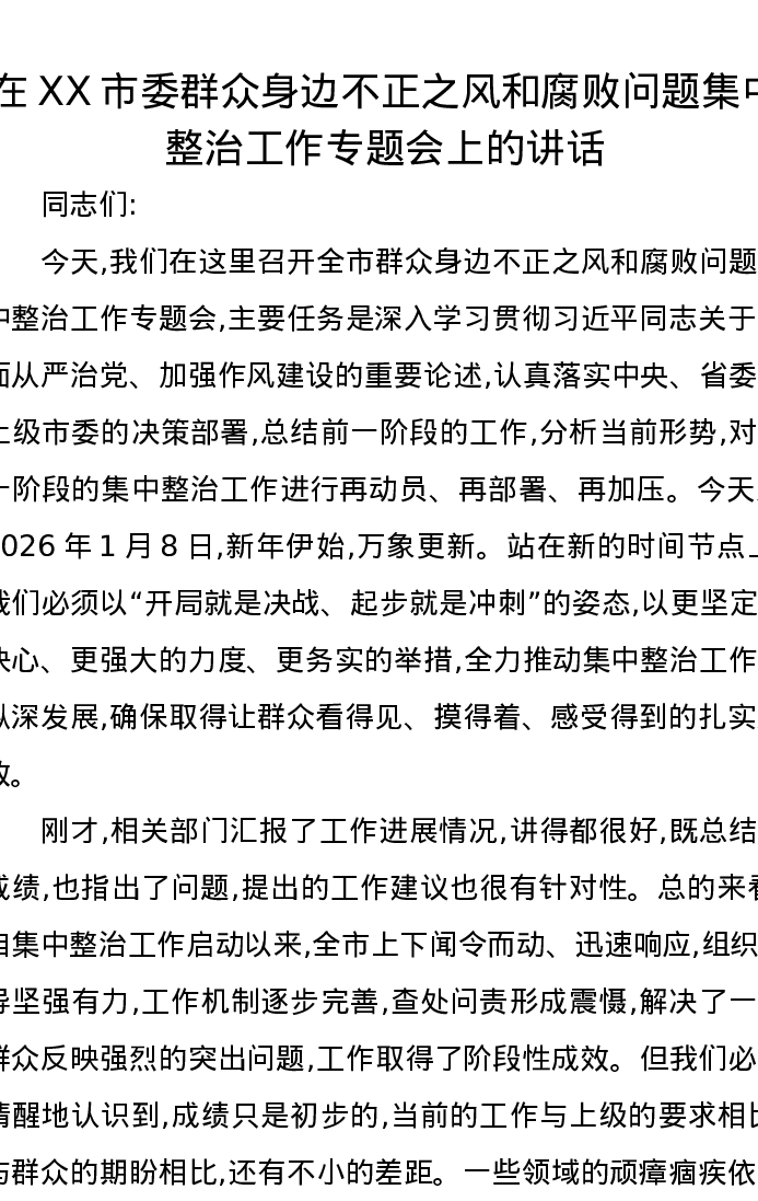 在XX市委群众身边不正之风和腐败问题集中整治工作专题会上的讲话