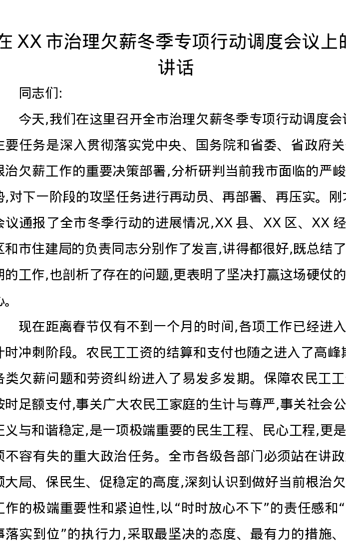 在XX市治理欠薪冬季专项行动调度会议上的讲话2