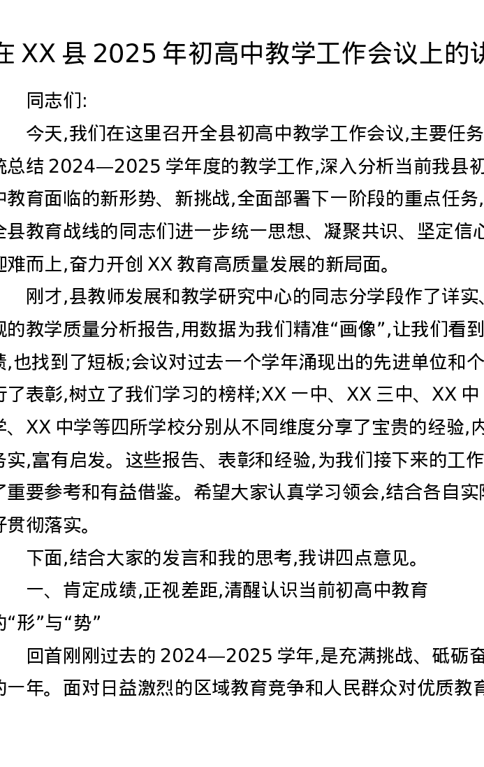 在XX县2025年初高中教学工作会议上的讲话