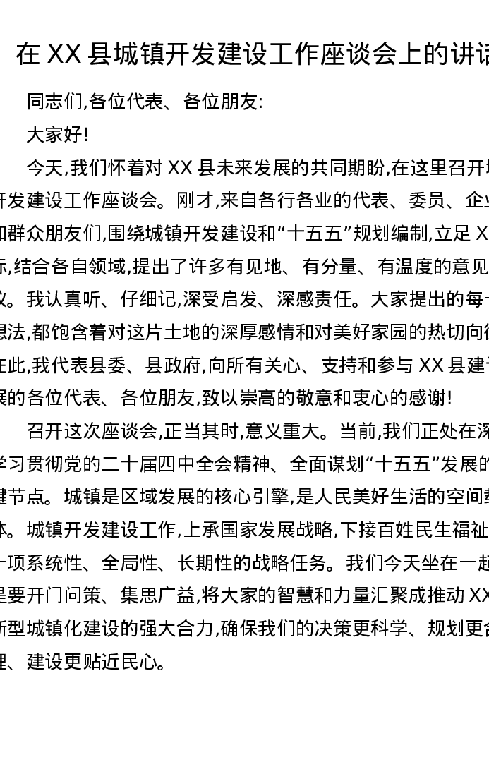 在XX县城镇开发建设工作座谈会上的讲话