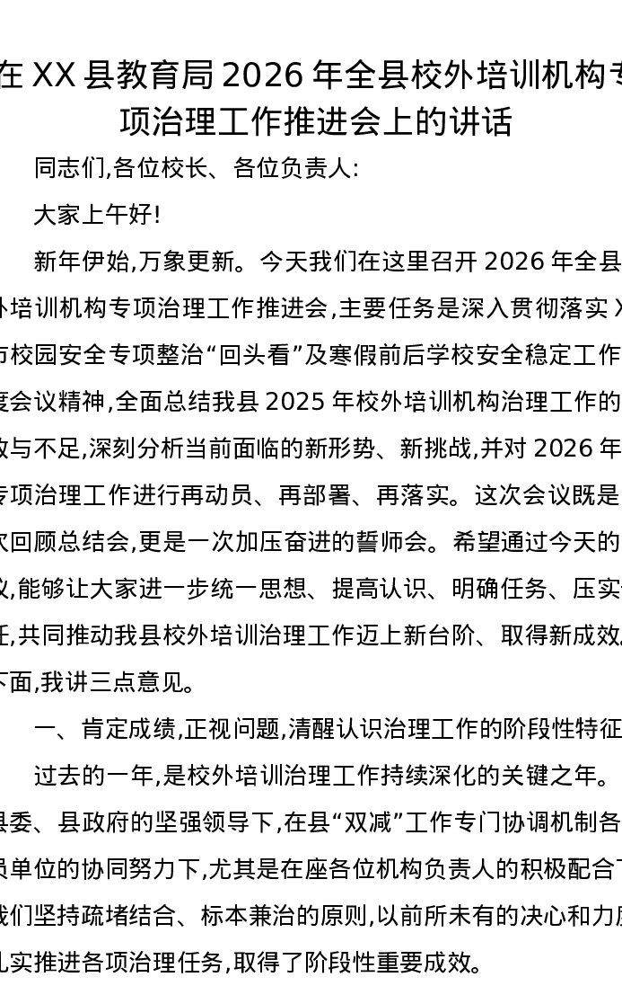 在XX县教育局2026年全县校外培训机构专项治理工作推进会上的讲话