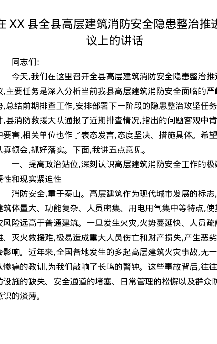 在XX县全县高层建筑消防安全隐患整治推进会议上的讲话