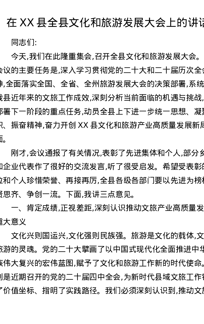 在XX县全县文化和旅游发展大会上的讲话