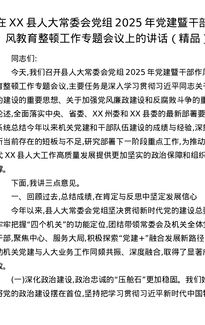 在XX县人大常委会党组2025年党建暨干部作风教育整顿工作专题会议上的讲话