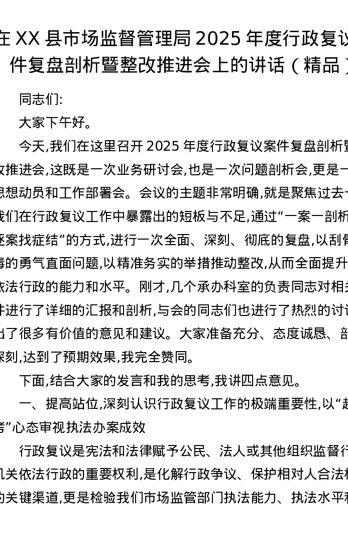 在XX县市场监督管理局2025年度行政复议案件复盘剖析暨整改推进会上的讲话