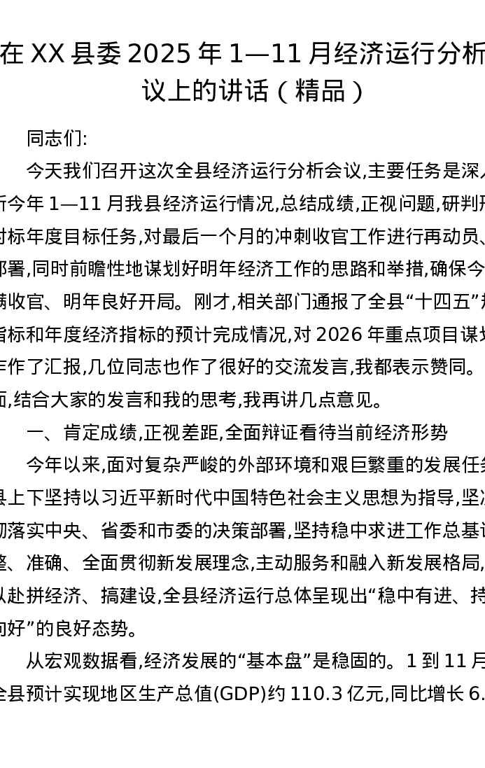 在XX县委2025年1—11月经济运行分析会议上的讲话