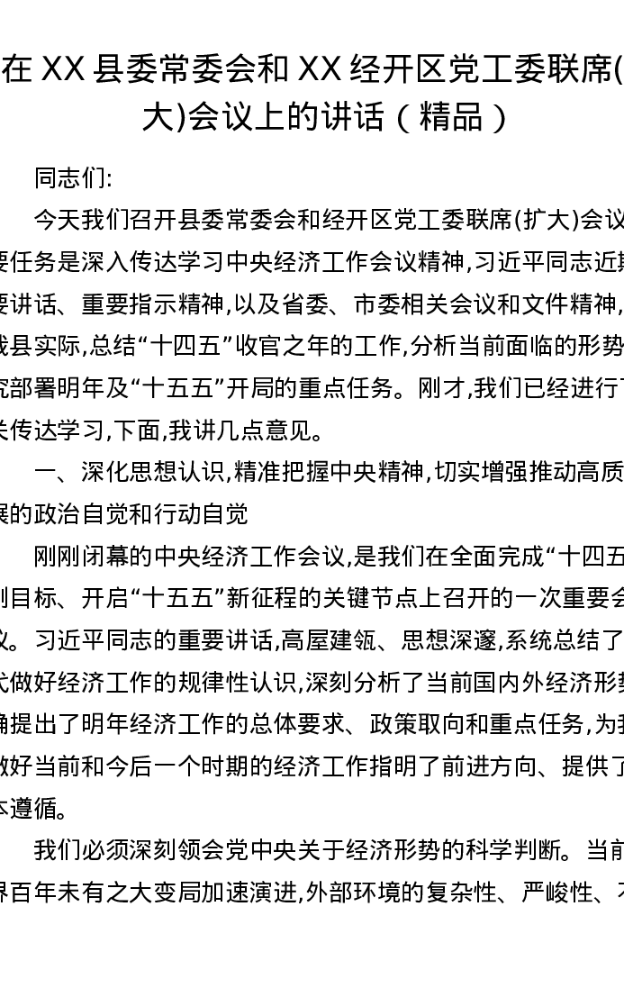 在XX县委常委会和XX经开区党工委联席(扩大)会议上的讲话