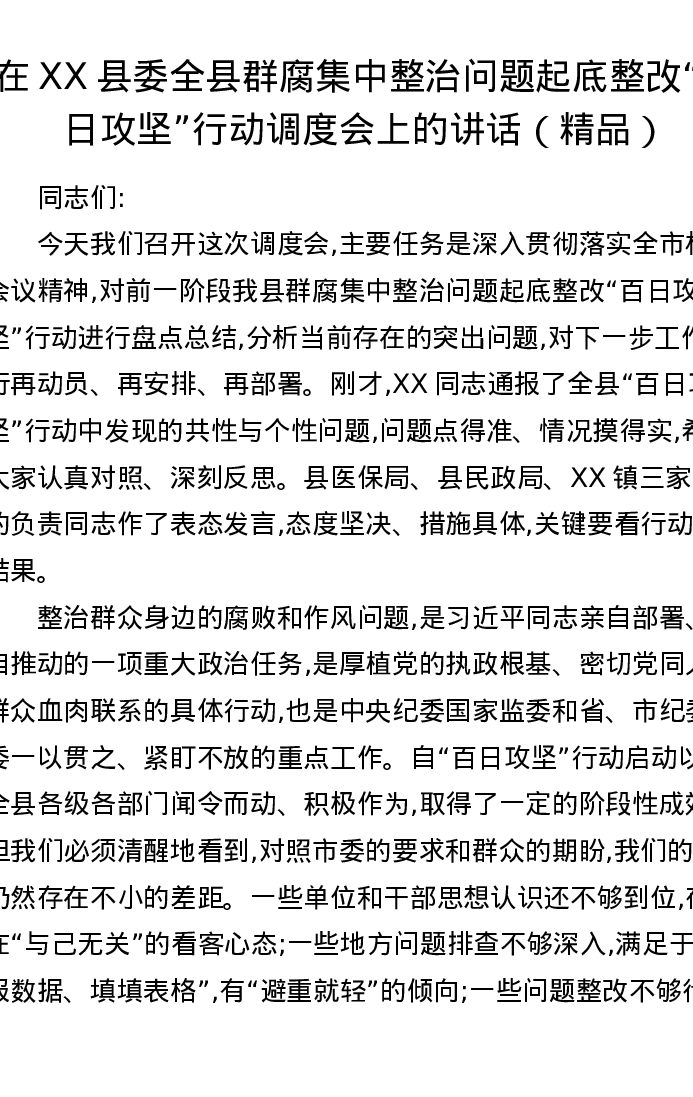 在XX县委全县群腐集中整治问题起底整改百日攻坚行动调度会上的讲话