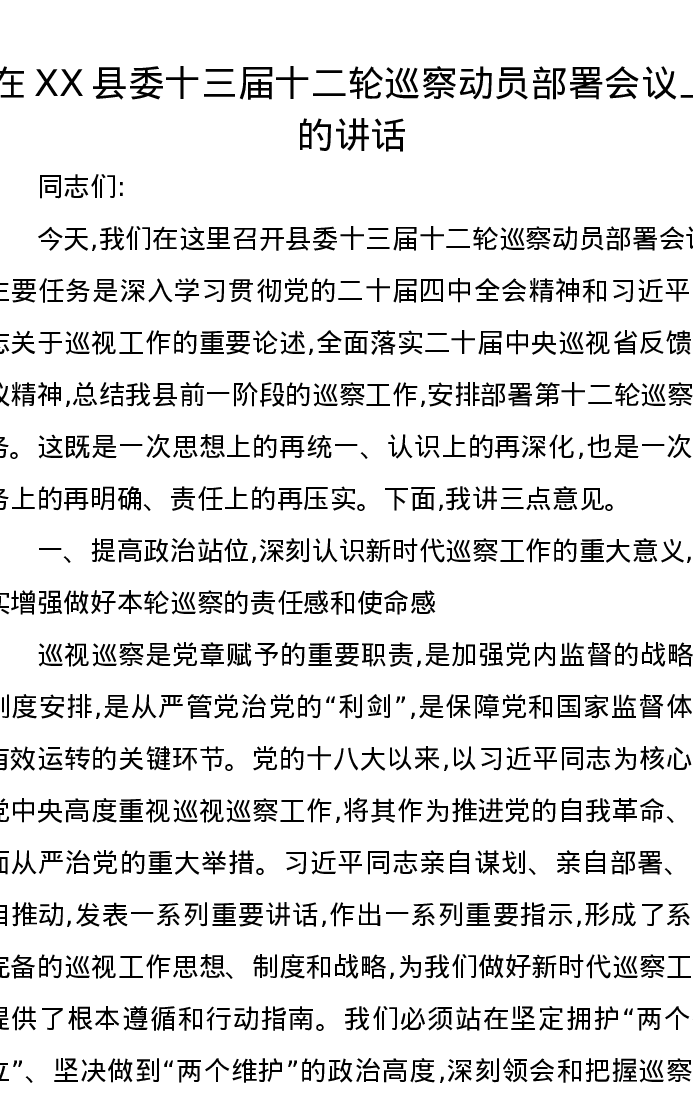 在XX县委十三届十二轮巡察动员部署会议上的讲话