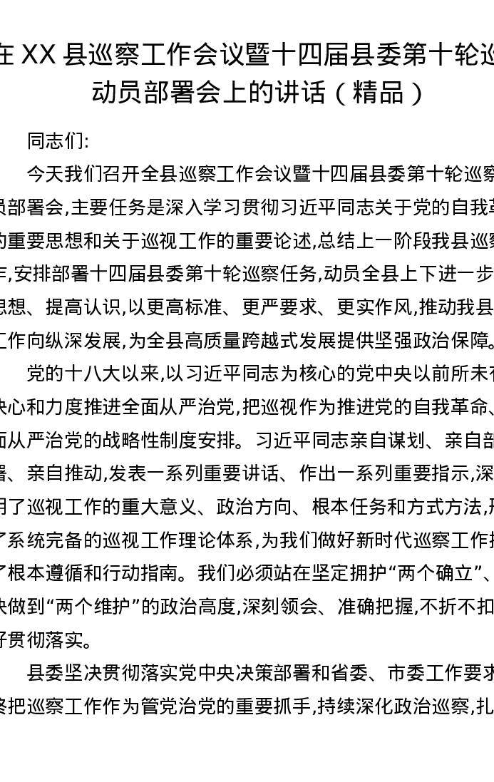 在XX县巡察工作会议暨十四届县委第十轮巡察动员部署会上的讲话