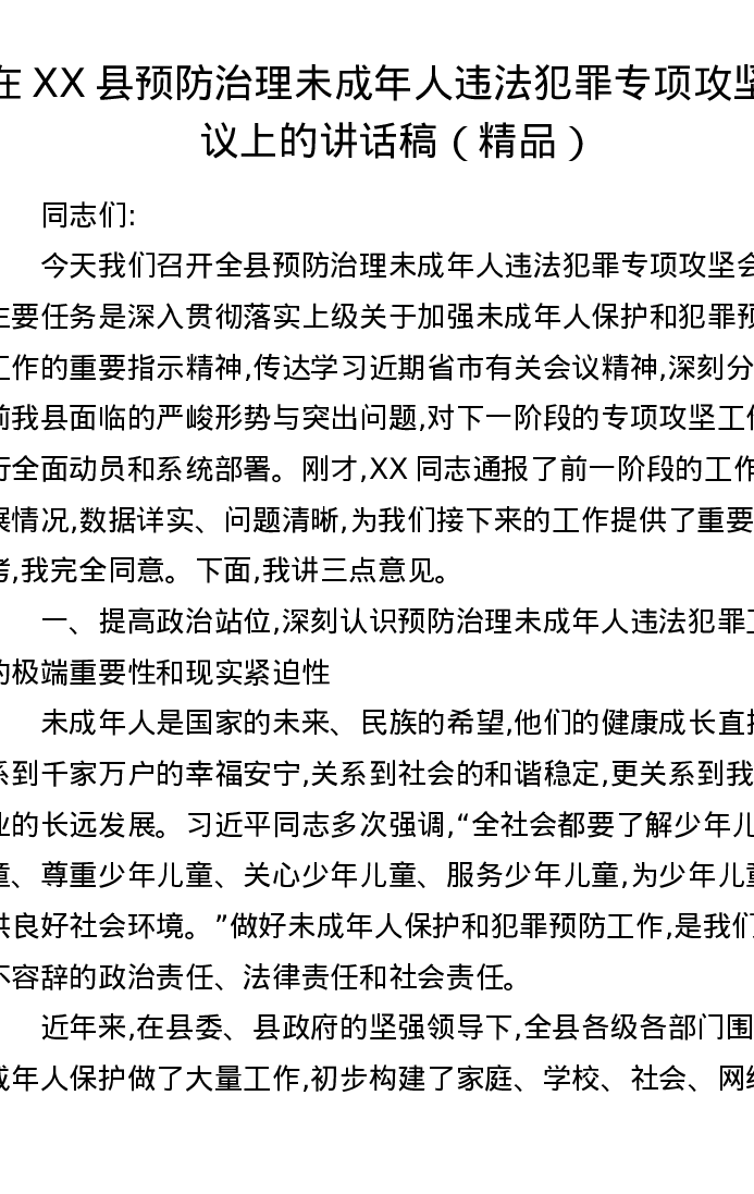在XX县预防治理未成年人违法犯罪专项攻坚会议上的讲话稿