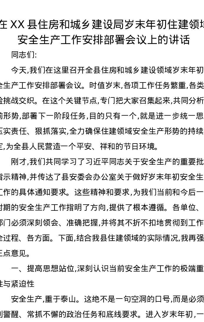 在XX县住房和城乡建设局岁末年初住建领域安全生产工作安排部署会议上的讲话