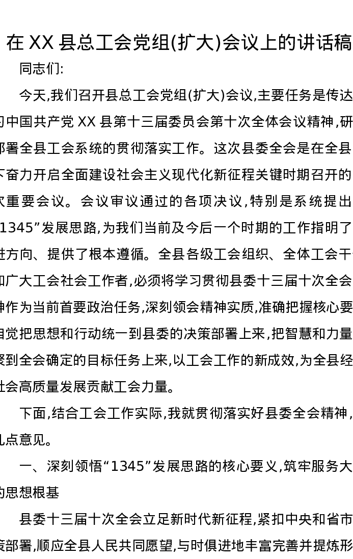 在XX县总工会党组(扩大)会议上的讲话稿