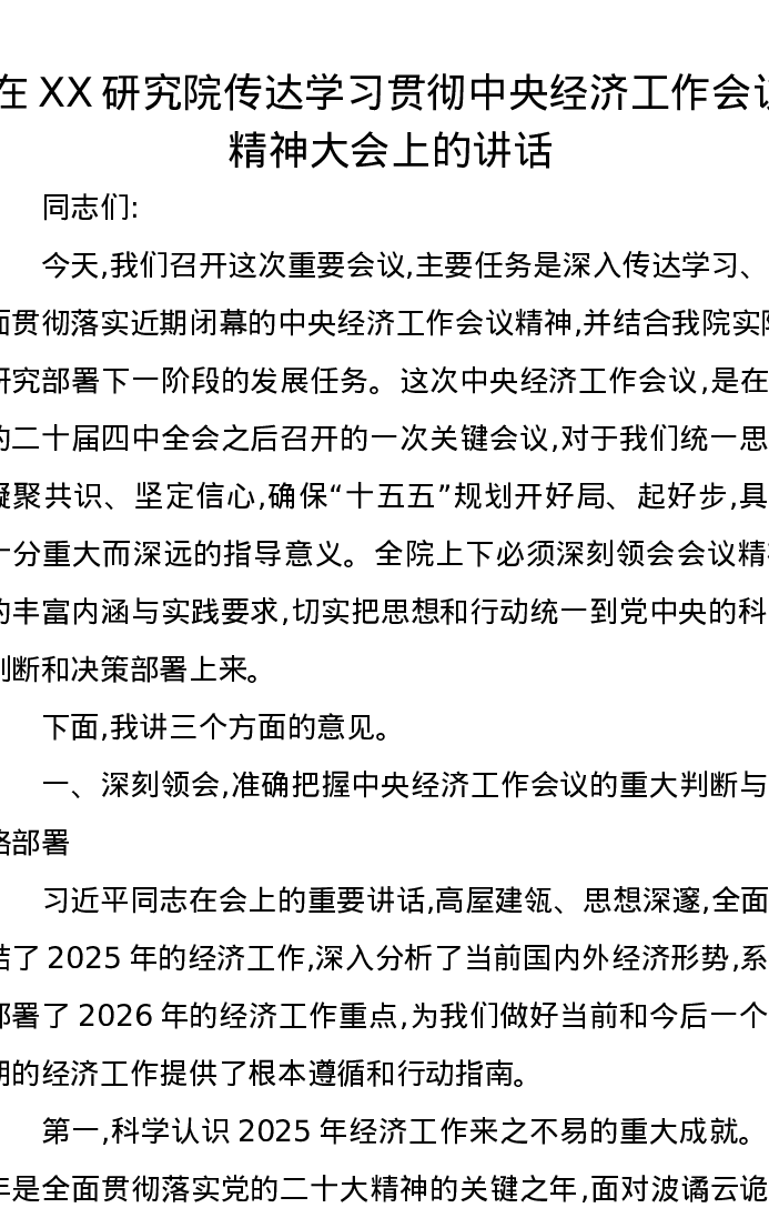 在XX研究院传达学习贯彻中央经济工作会议精神大会上的讲话