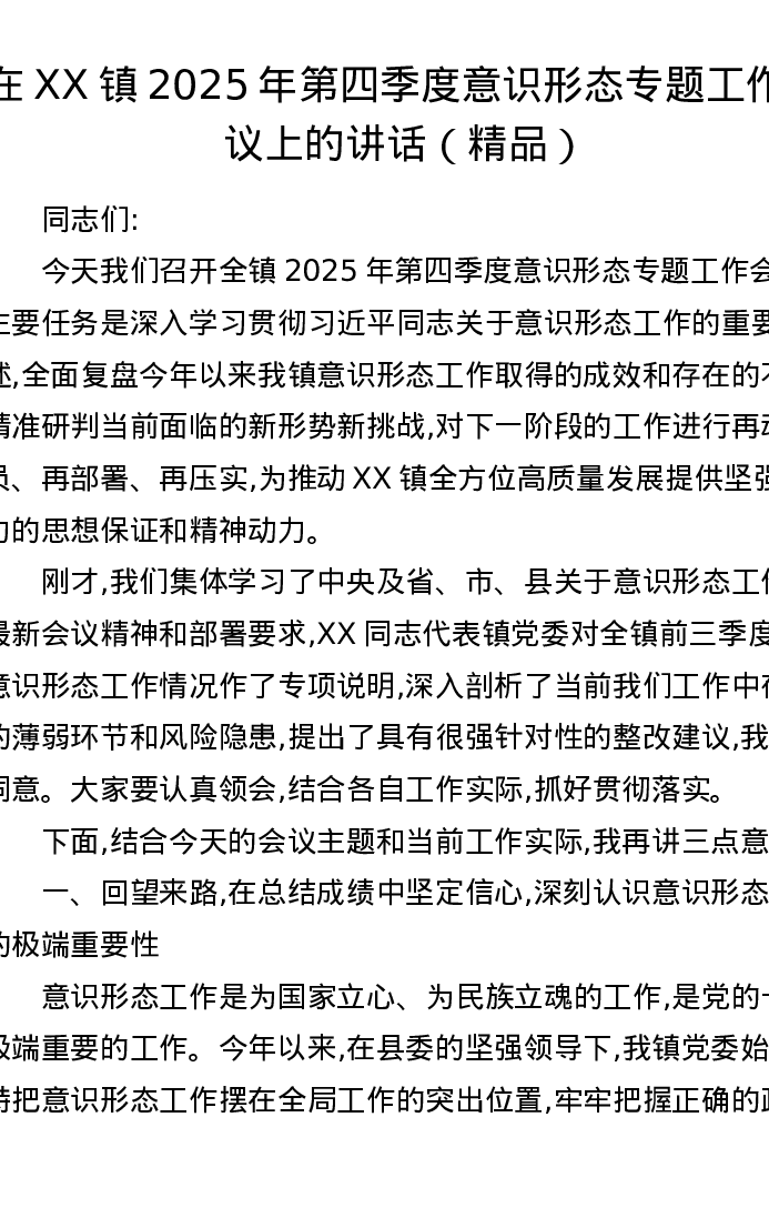 在XX镇2025年第四季度意识形态专题工作会议上的讲话