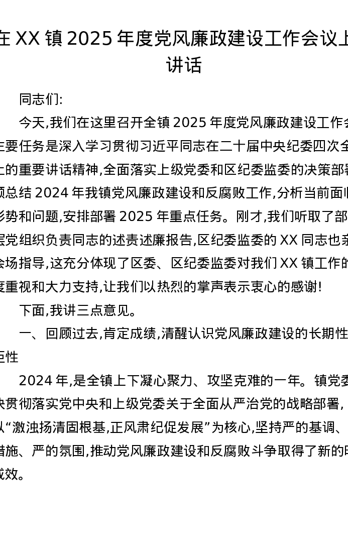 在XX镇2025年度党风廉政建设工作会议上的讲话