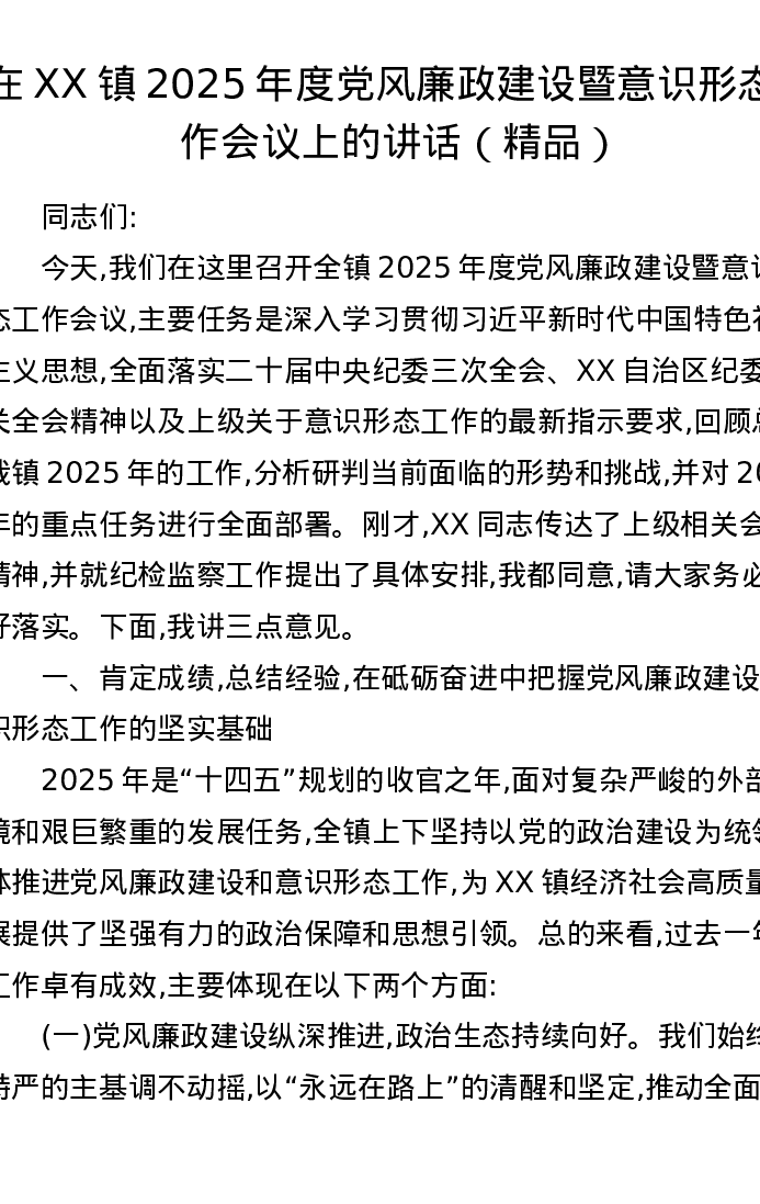 在XX镇2025年度党风廉政建设暨意识形态工作会议上的讲话