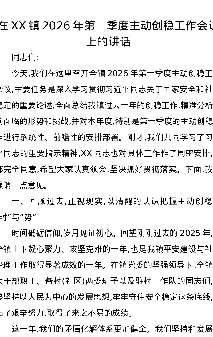 在XX镇2026年第一季度主动创稳工作会议上的讲话