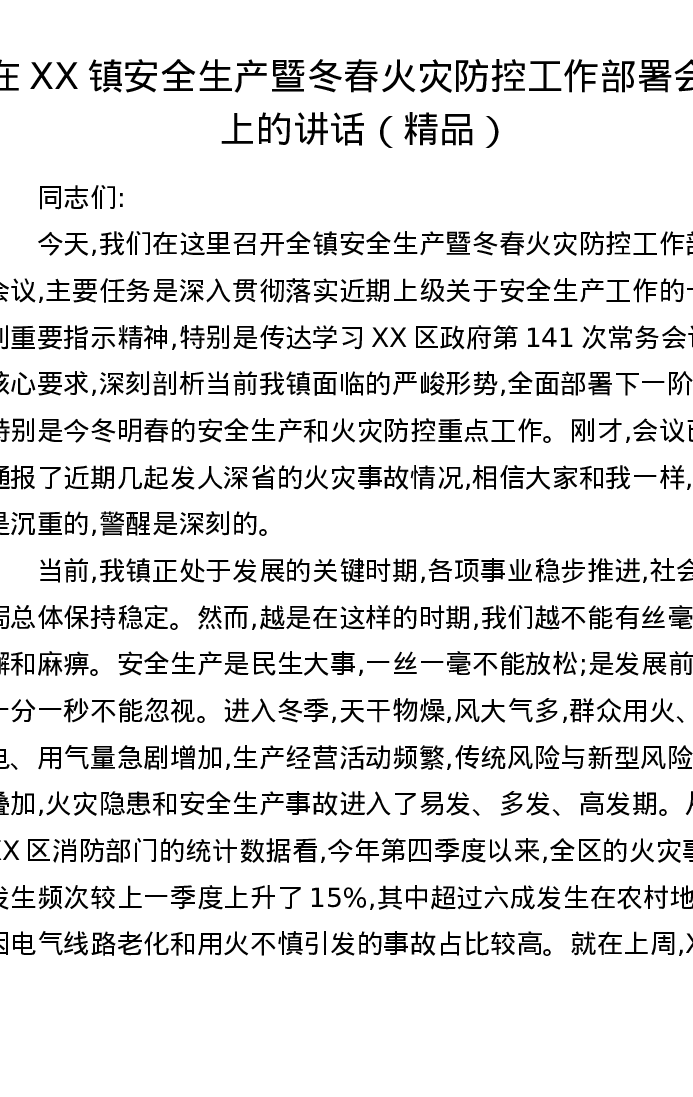 在XX镇安全生产暨冬春火灾防控工作部署会议上的讲话