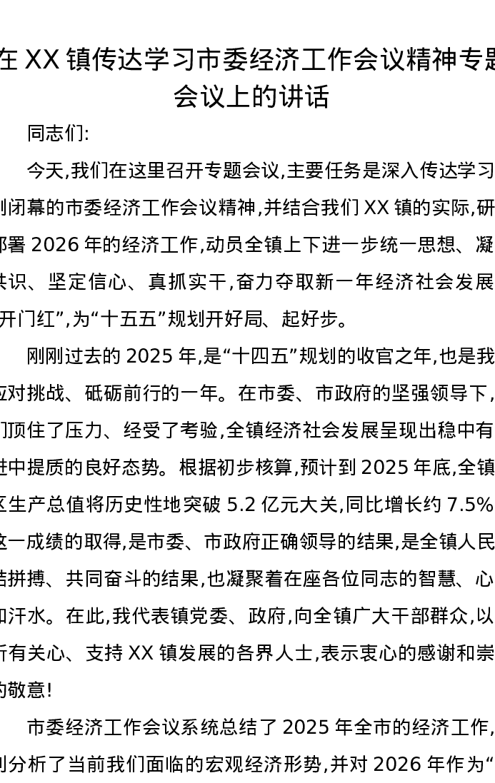 在XX镇传达学习市委经济工作会议精神专题会议上的讲话
