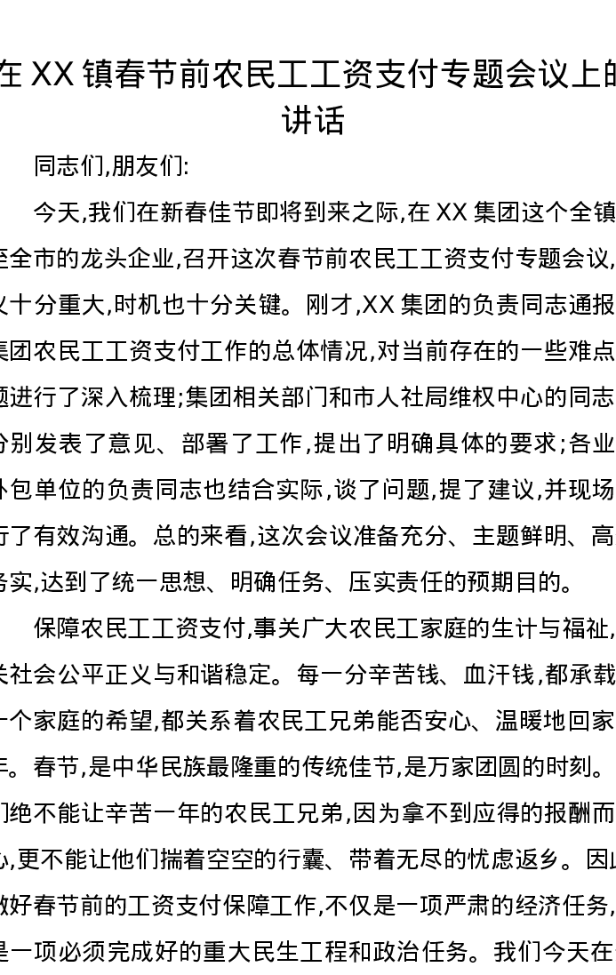 在XX镇春节前农民工工资支付专题会议上的讲话