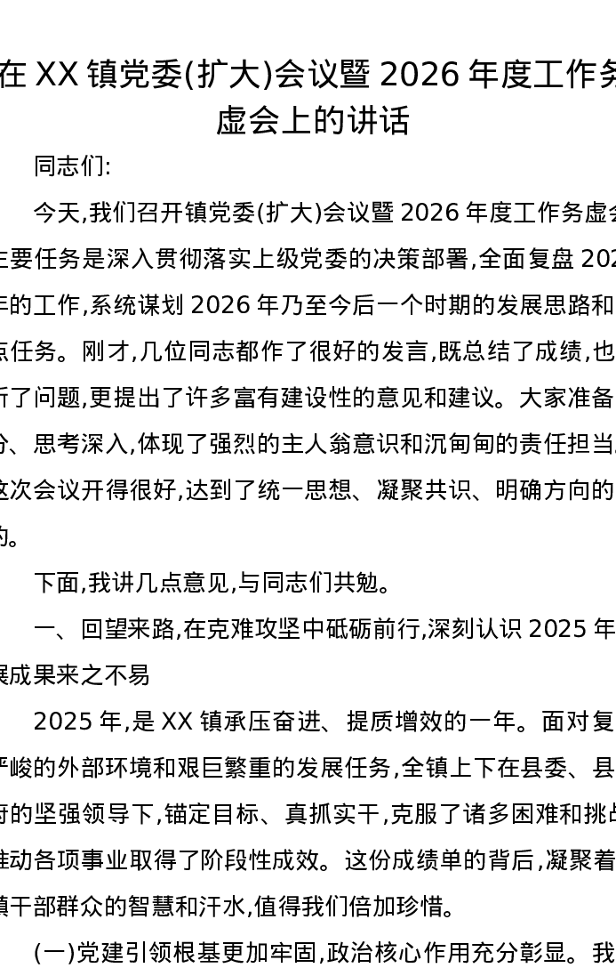 在XX镇党委(扩大)会议暨2026年度工作务虚会上的讲话