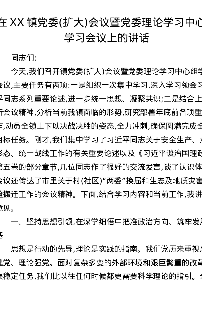 在XX镇党委(扩大)会议暨党委理论学习中心组学习会议上的讲话